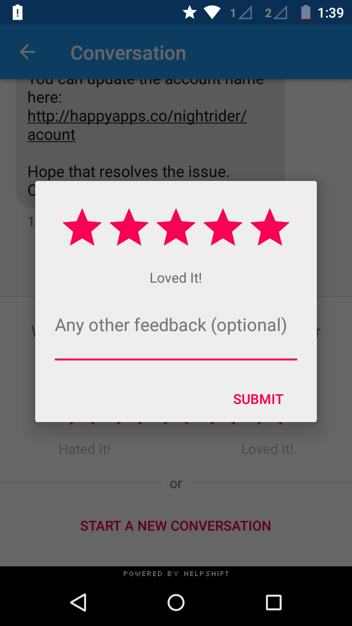 Helpshift SDK adds a way for customers to send feedback in review reminders.