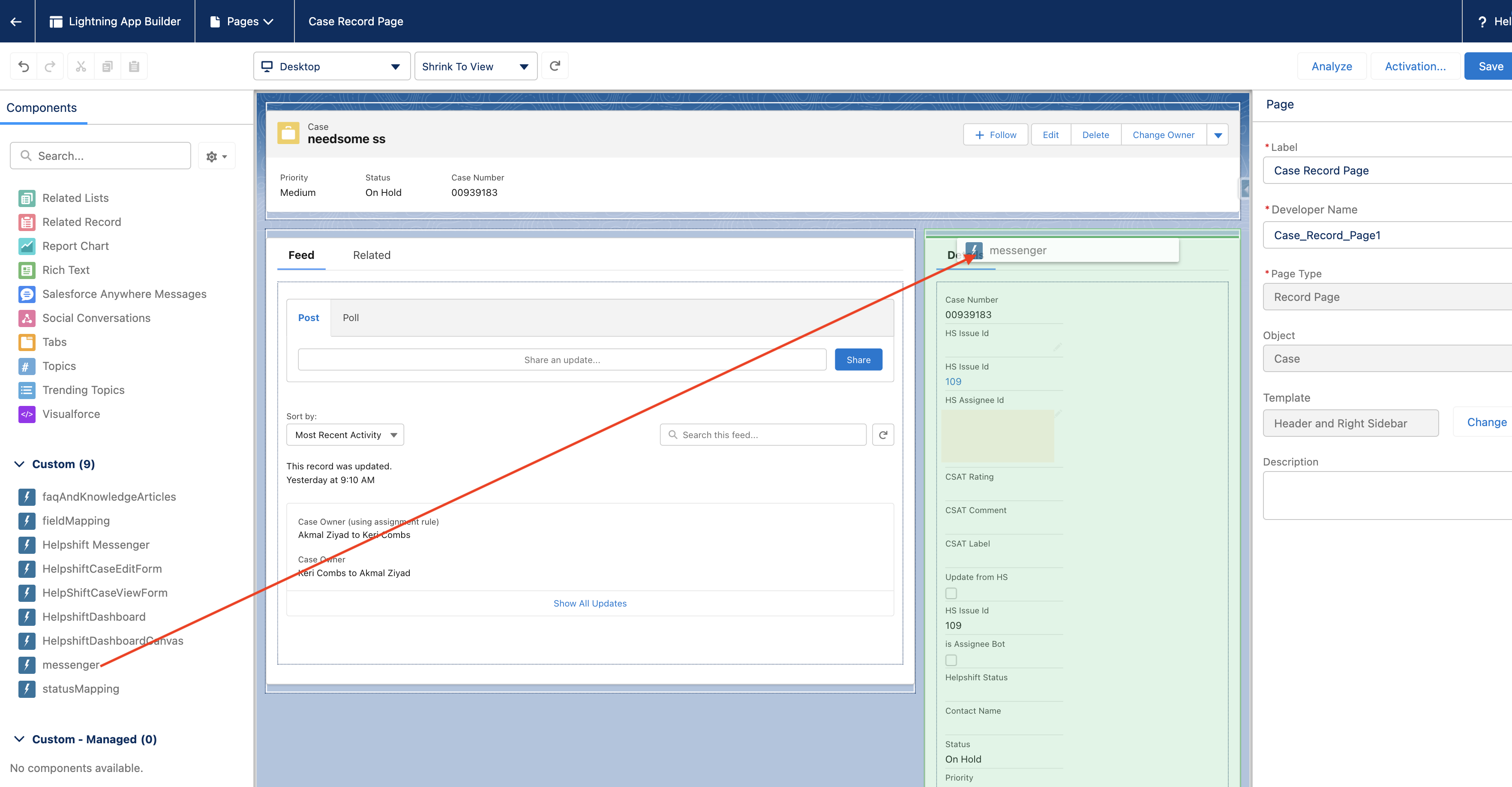4. Manually add the new Helpshift Messenger to the case record page. (Steps for this are described in the next section.)