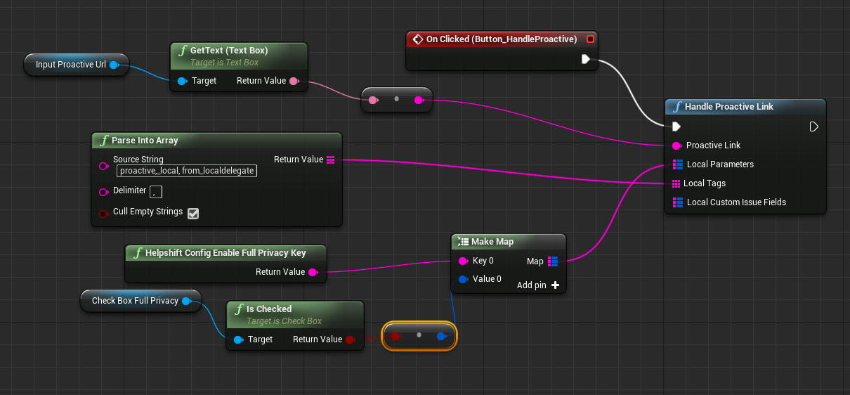 Below is an example blueprint. For demo purposes the example calls Handle Proactive Link function on a button click. Ideally, this should be handled as a part of a notification click from the user.
