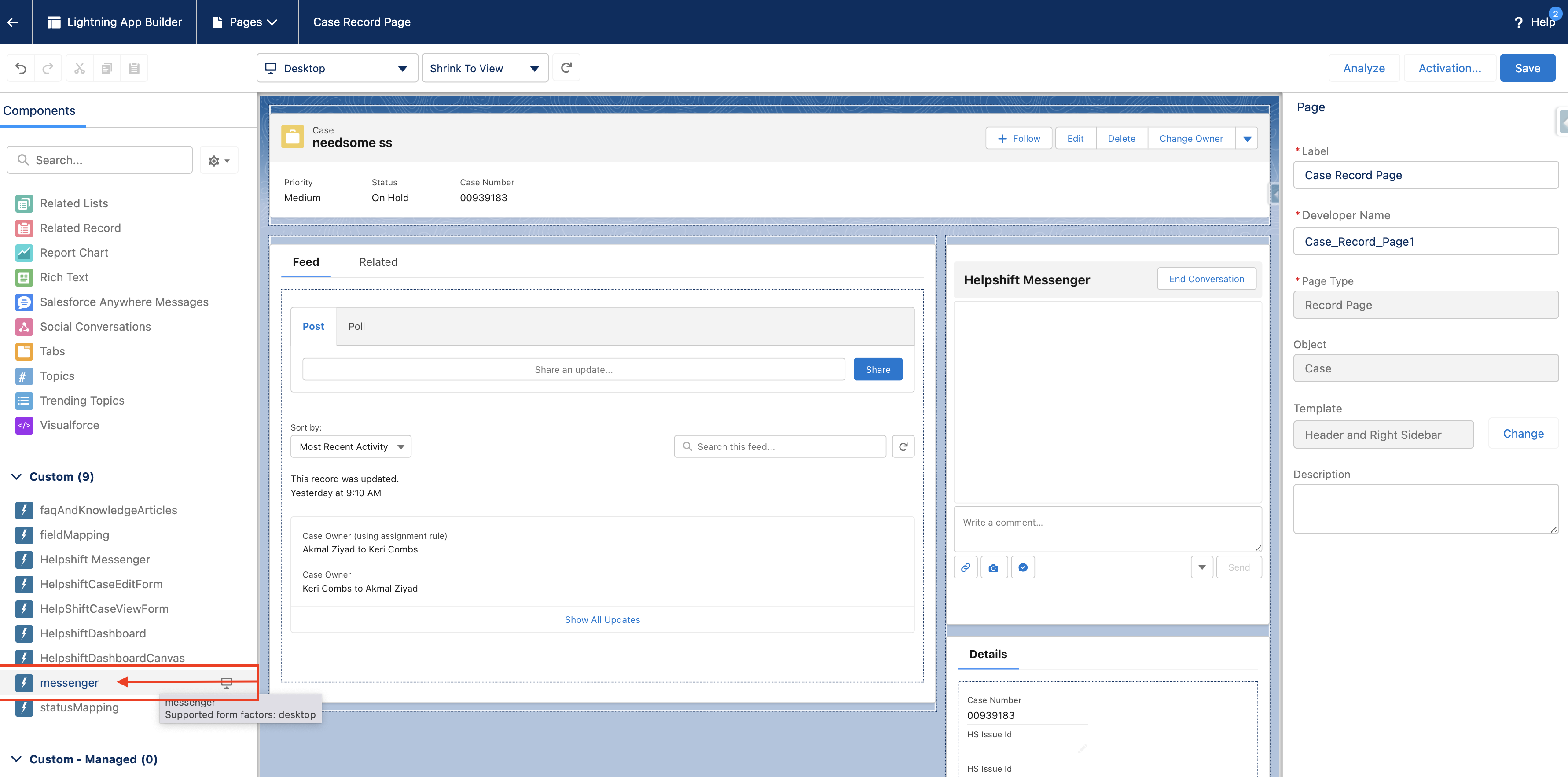 - Manually add the new Helpshift Messenger to the case record page. (Steps for this are described in the next section.)