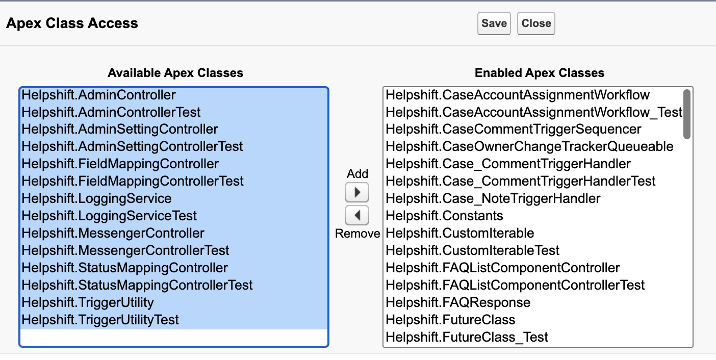 2. Check if Helpshift_Standard_Object permission set has the new Apex classes permissions. If not, add them directly as shown below.